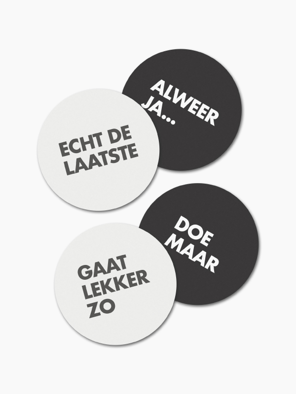 Geef je borreltafel wat extra humor met deze set van 4 onderzetters met korte, grappige teksten. Leuk voor jezelf én om cadeau te doen.